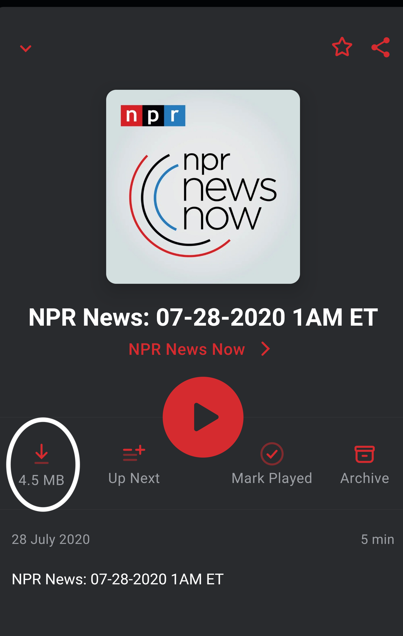 - Tap on an episode row, then tap the downward arrow icon download button.