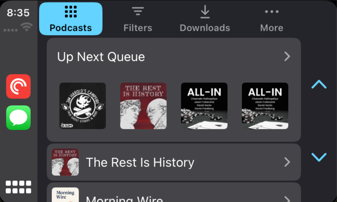 Pocket Casts on CarPlay features an easy-to-navigate interface with tabs that mirror your phone’s organization, ensuring a familiar and hassle-free experience. Here’s what you can expect: