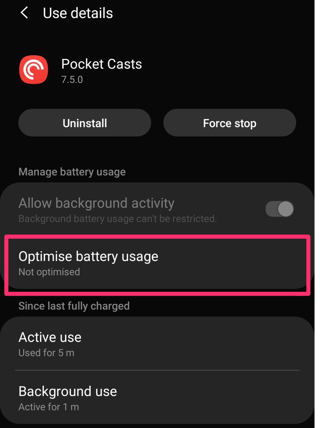 To ensure that playback is uninterrupted Pocket Casts needs to be granted unrestricted battery usage. Otherwise, the operating system will sometimes stop playback when the phone’s screen is off or the app is in the background. While battery optimization helps conserve battery power on your device, the feature can also cause problems with apps that need to function in the background, including Pocket Casts.