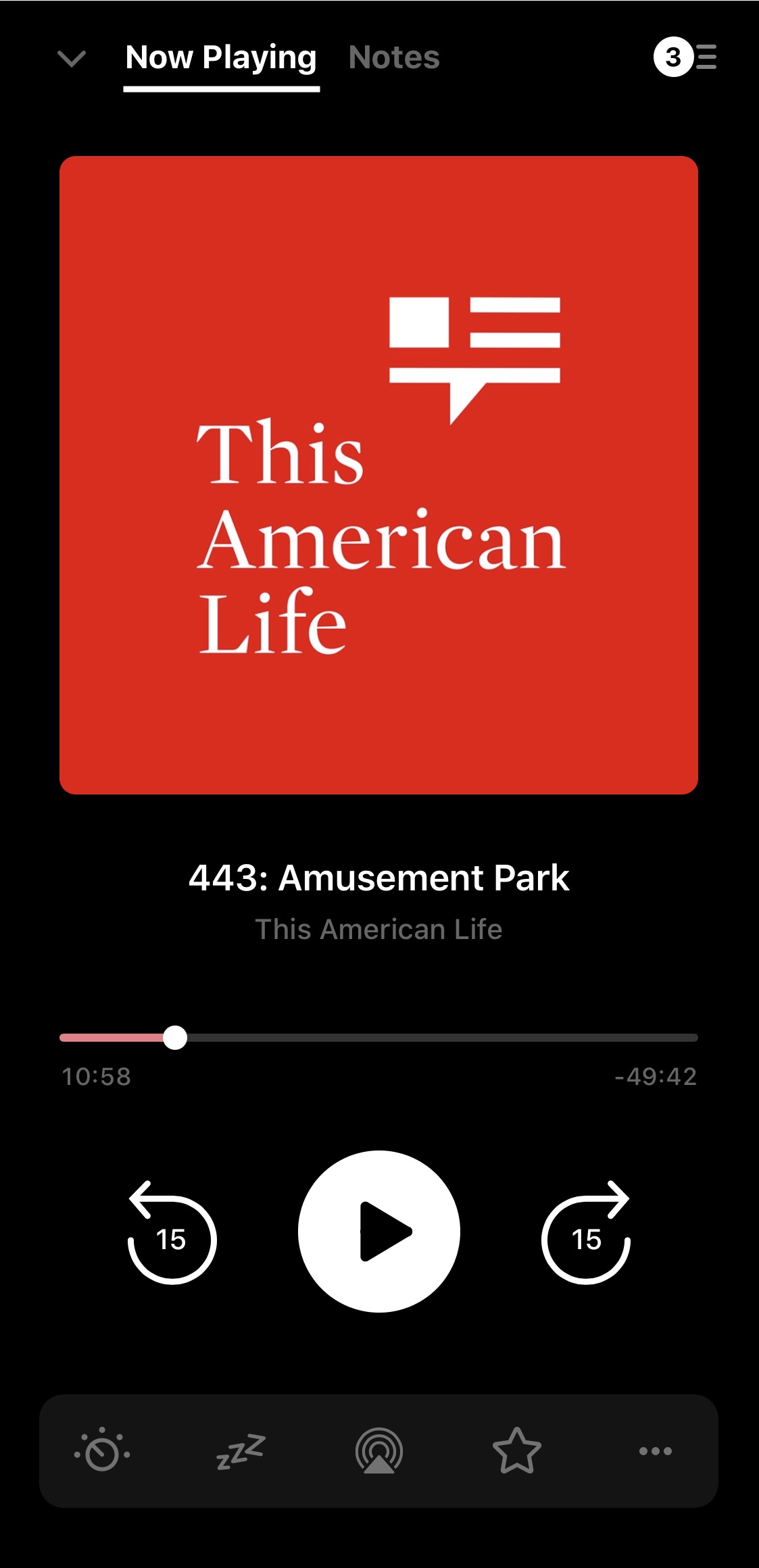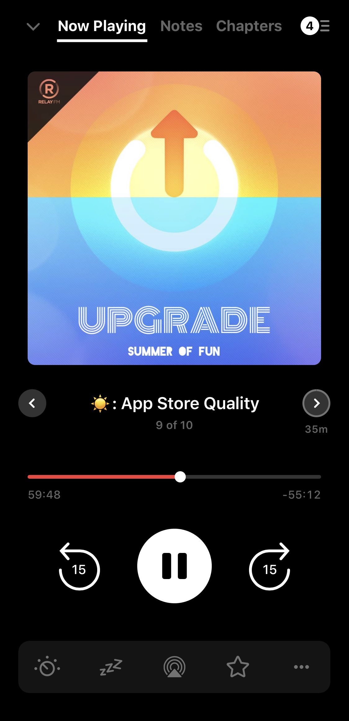 The Now Playing screen is where you can view the episode or file that is currently in the app’s player. From here you can interact with the episode, quickly view its Notes, access Chapters if the episode has any available, and access your Up Next queue if you have one.