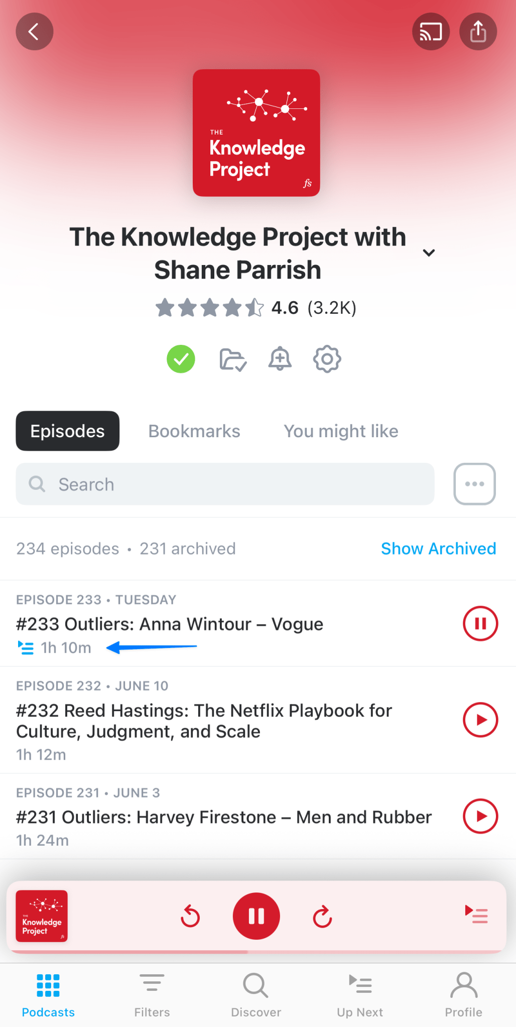 Check out how to add episodes to the app’s playlist, Up Next, here. To view your Up Next queue tap the Up Next button on the mini player or in the full screen player, or swipe up in the full screen player. When you play an episode, or a file, it will automatically be added to the Up Next list. Once you finish listening to the episode or file, it will disappear from the Up Next list.