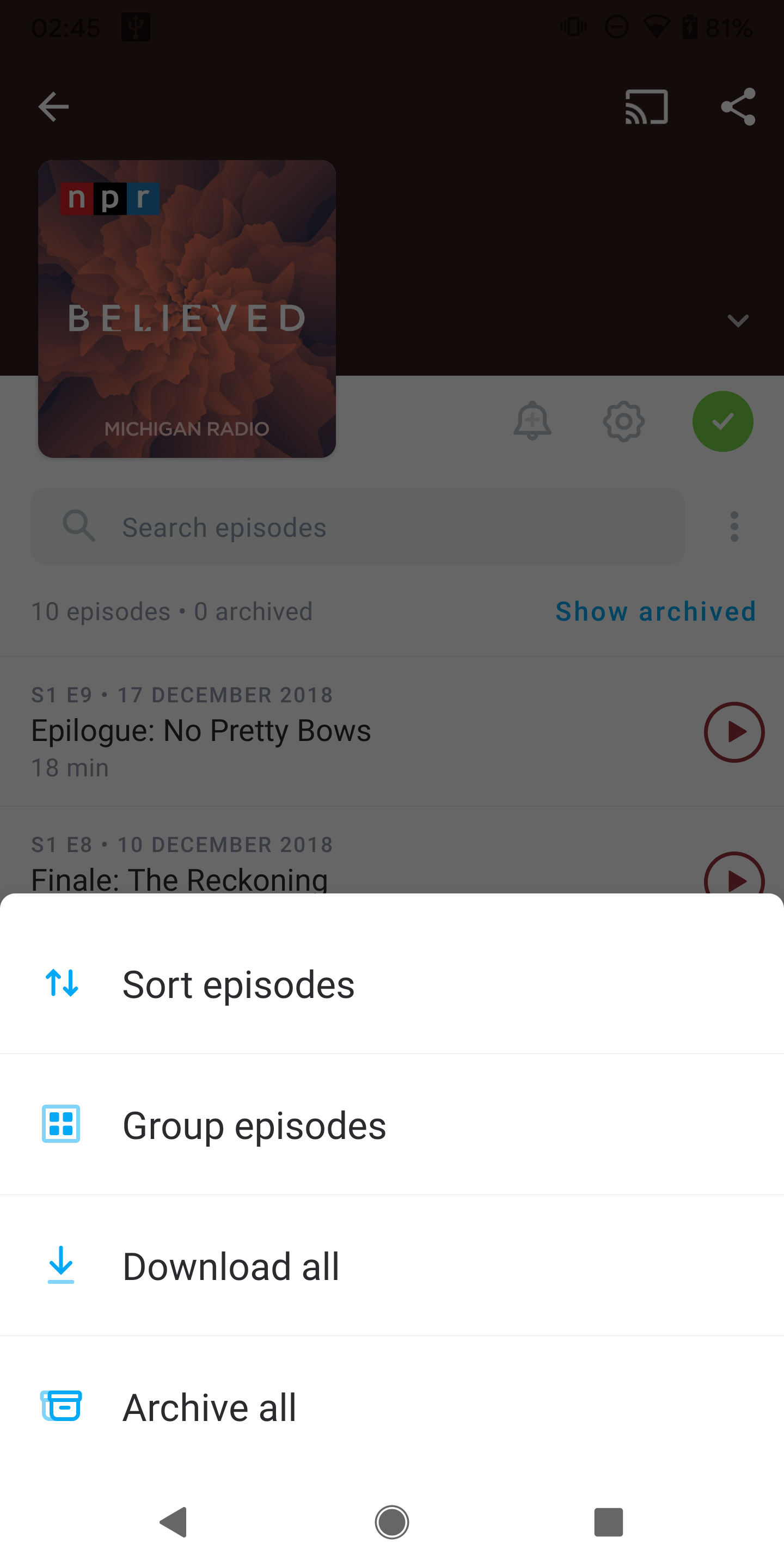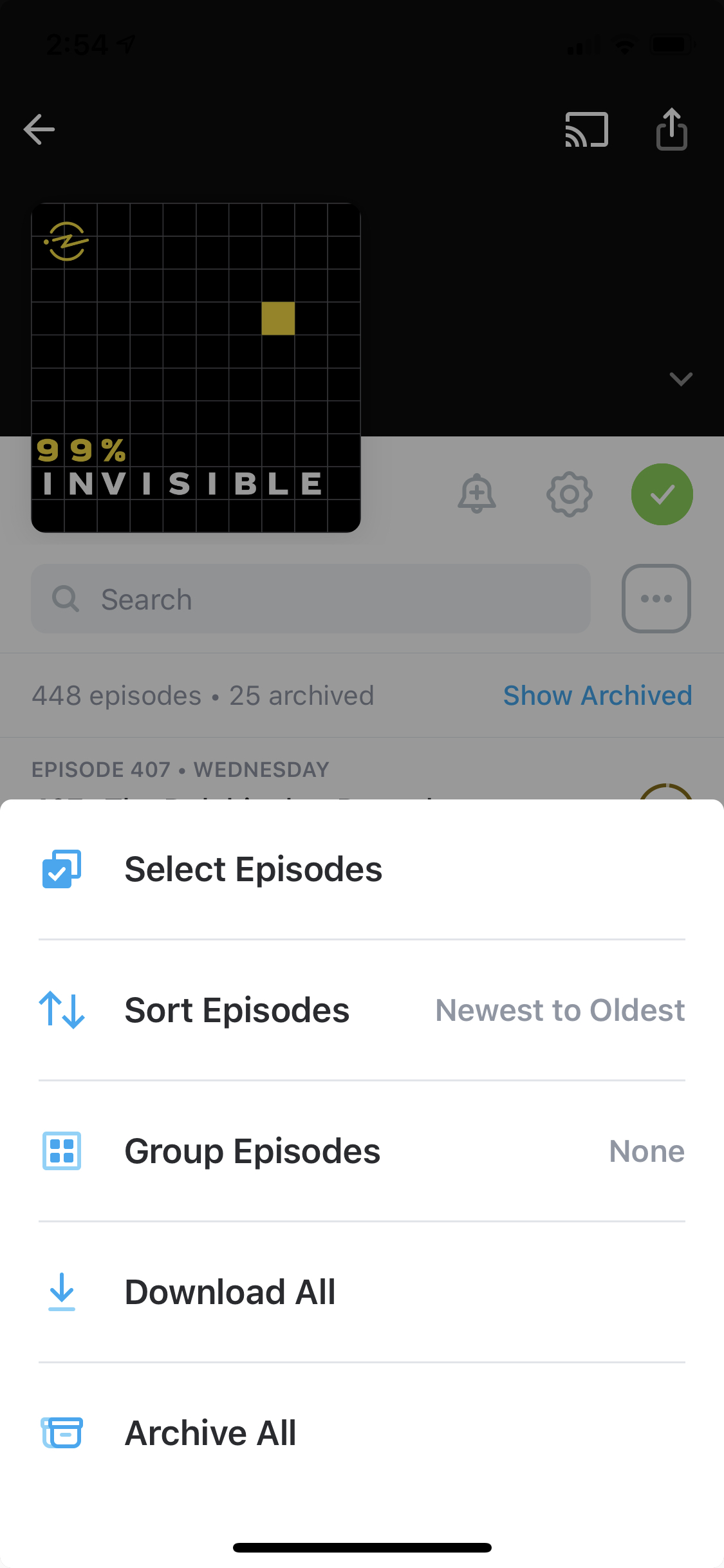 The three dot menu / gives options for arranging episodes and other actions you can take, whether you’re following the podcast or not: Select Episodes (available on iOS), Sort Episodes, Group Episodes, Download All, Archive All